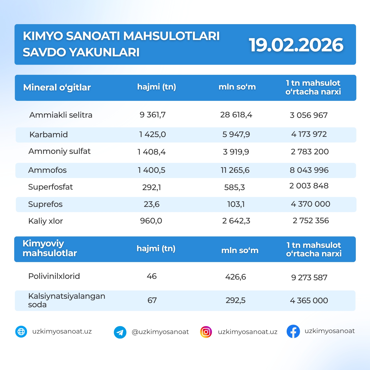 O‘zbekiston Respublika tovar-xom ashyo birjasidagi kimyo sanoati mahsulotlarining savdo yakunlari : 19.02.2026