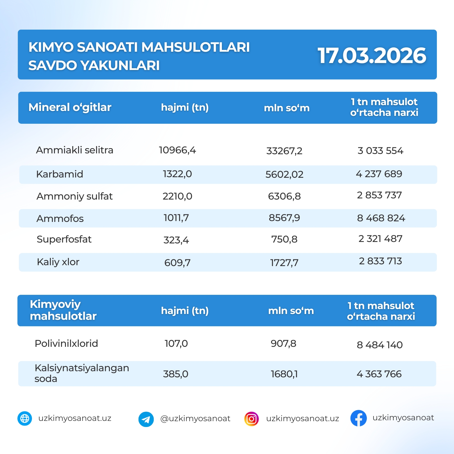 O‘zbekiston Respublika tovar-xom ashyo birjasidagi kimyo sanoati mahsulotlarining savdo yakunlari: 17.03.2026