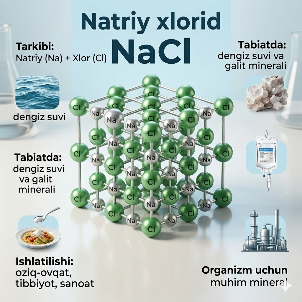 - Ishlatilishi: Taomlarga lazzat berish, mahsulotlarni konservalash, sanoatda kaustik soda va xlor olishda, tibbiyotda esa infuzion eritmalar tayyorlashda qo'llaniladi.