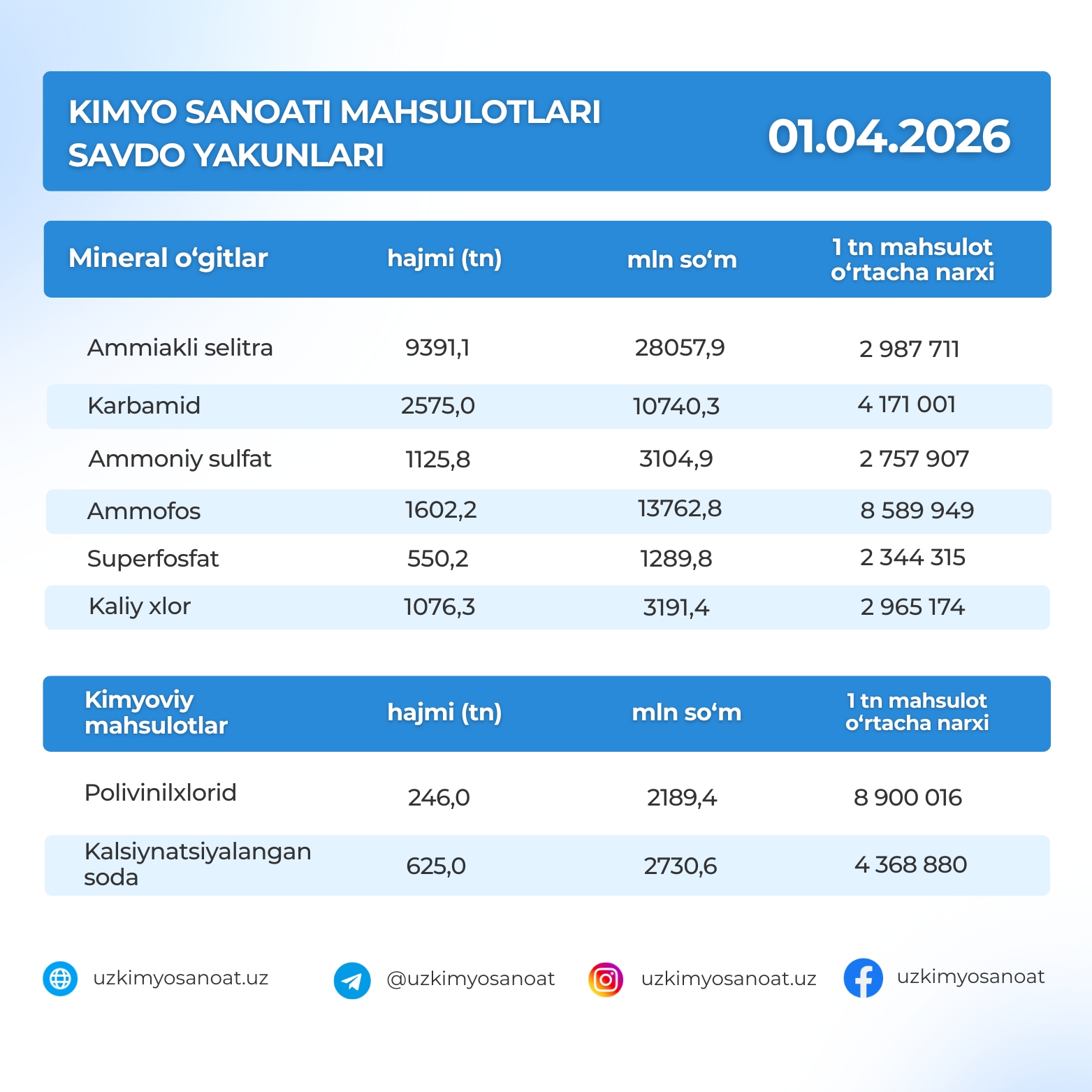 O‘zbekiston Respublika tovar-xom ashyo birjasidagi kimyo sanoati mahsulotlarining savdo yakunlari: 01.04.2026