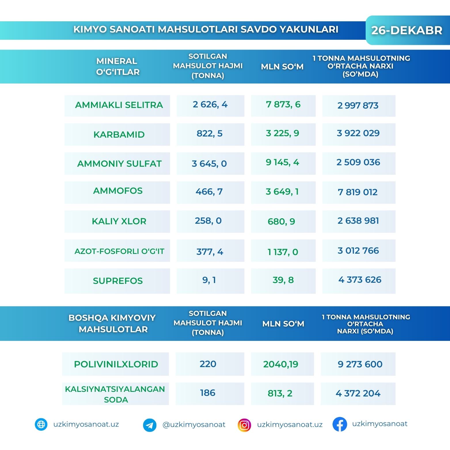 O‘zbekiston Respublika tovar-xom ashyo birjasidagi kimyo sanoati mahsulotlarining 26-dekabr kunidagi savdo yakunlari