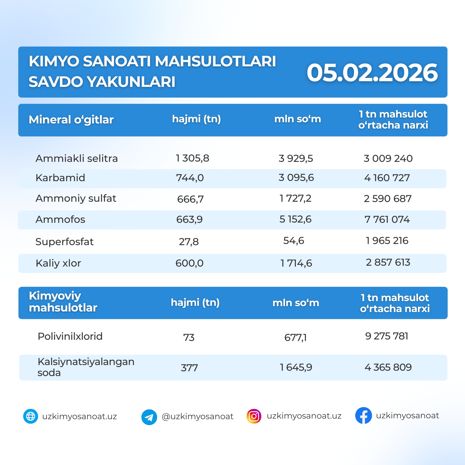 O‘zbekiston Respublika tovar-xom ashyo birjasidagi kimyo sanoati mahsulotlarining savdo yakunlari : 05.02.2026