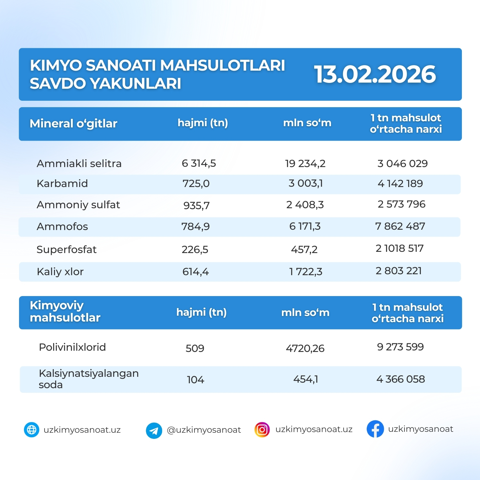 O‘zbekiston Respublika tovar-xom ashyo birjasidagi kimyo sanoati mahsulotlarining savdo yakunlari: 13.02.2026