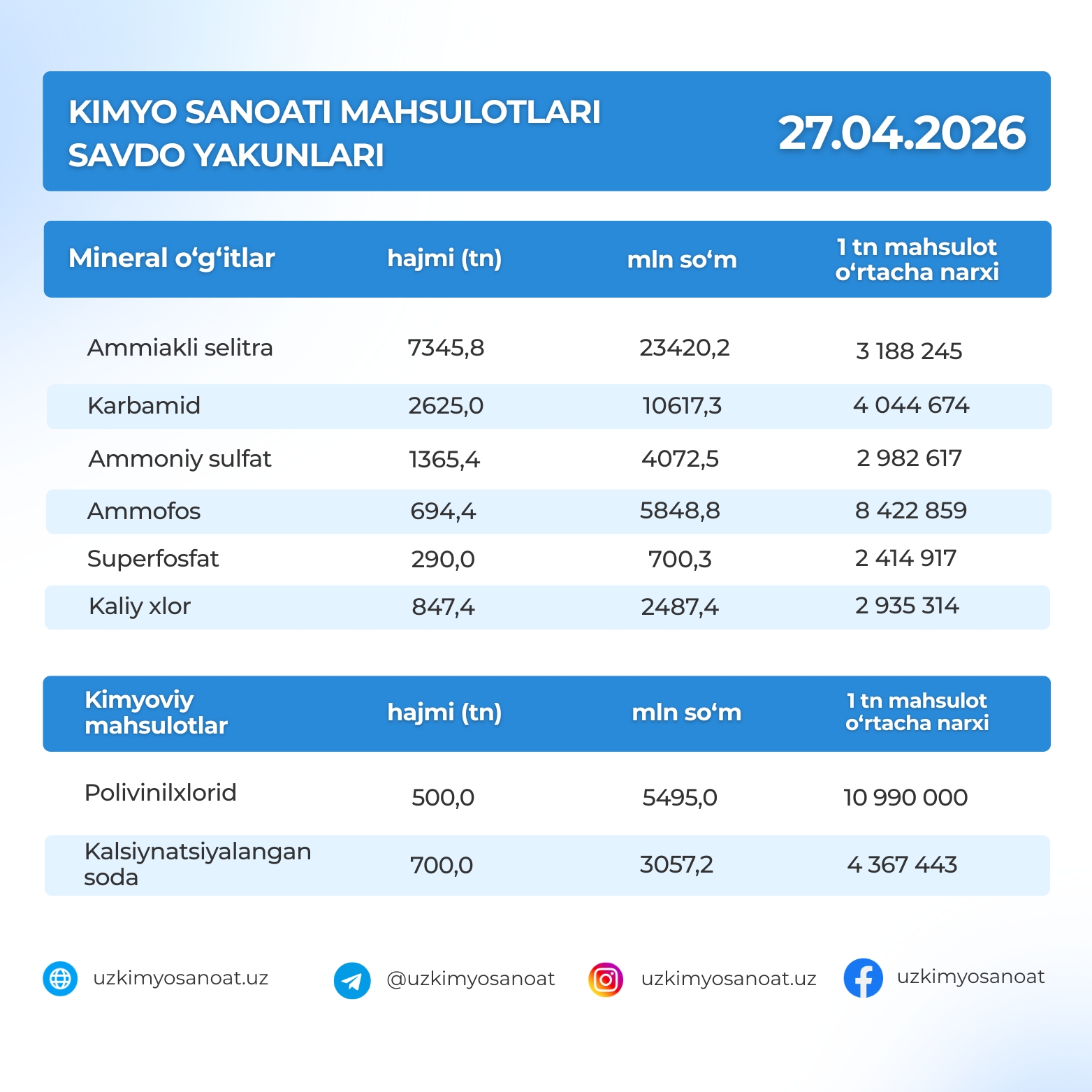 O‘zbekiston Respublika tovar-xom ashyo birjasidagi kimyo sanoati mahsulotlarining savdo yakunlari: 27.04.2026