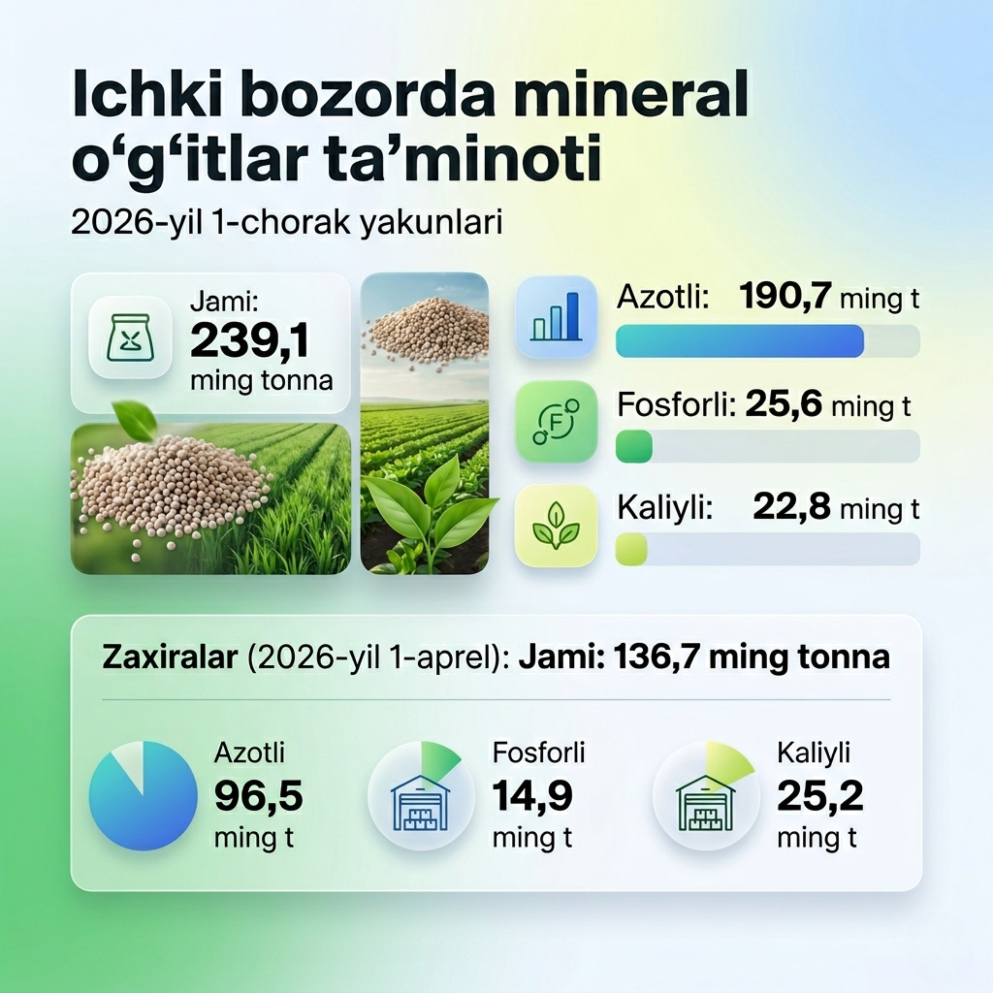 2026-yil 1-aprel holatiga koʻra, mineral oʻgʻitlar zaxiralari ham yetarli darajada shakllantirilgan. Jumladan, korxonalarning texnologik hamda hududlardagi ijara omborlarida jami 136,7 ming tonna oʻgʻit mavjud. Ularning 96,5 ming tonnasi azotli, 14,9 ming tonnasi fosforli va 25,2 ming tonnasi kaliyli oʻgʻitlardan iborat.