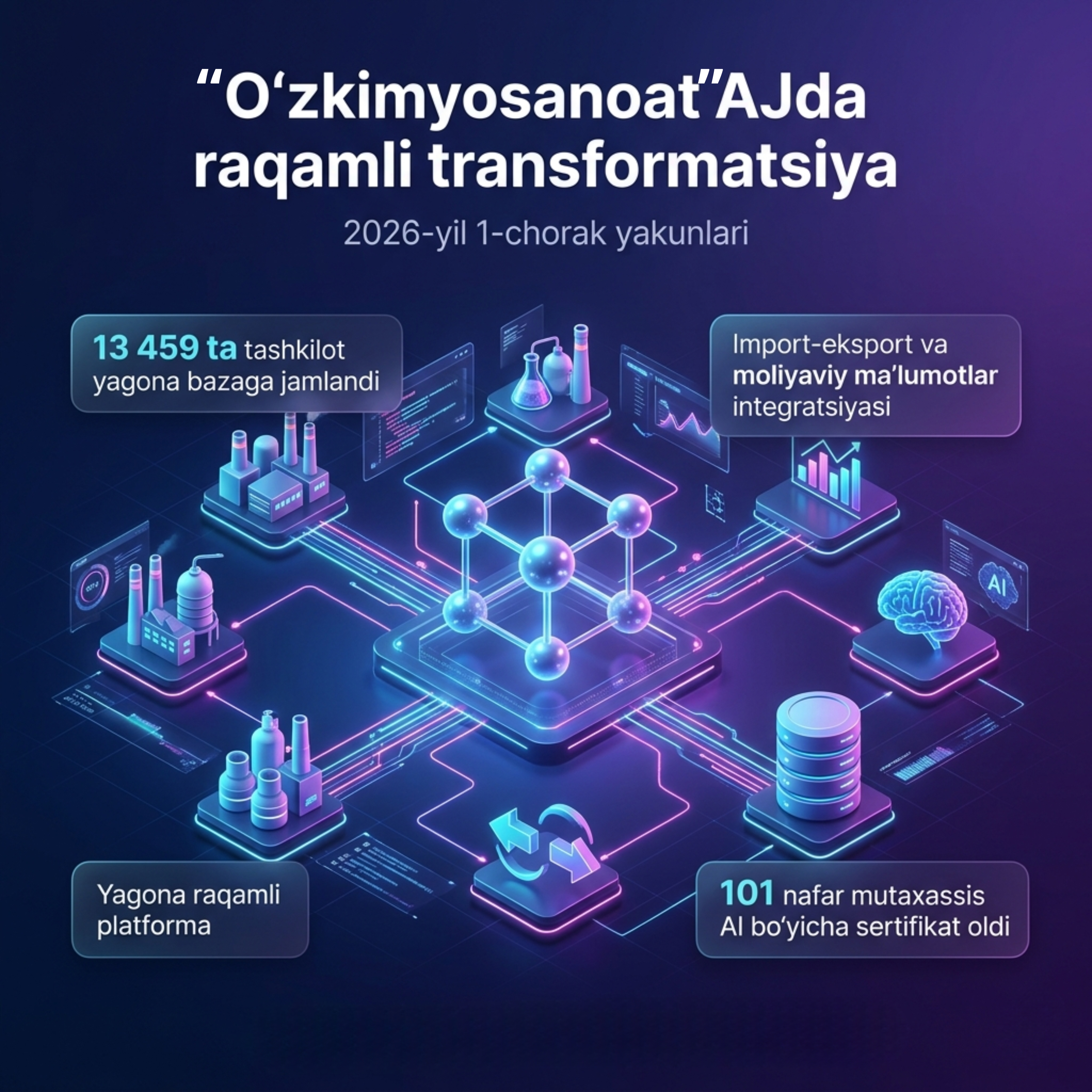 2026-yilning birinchi choragida “Oʻzkimyosanoat” AJ tomonidan kimyo sanoatini raqamlashtirish va zamonaviy boshqaruv mexanizmlarini joriy etish borasida qator muhim ishlar bajarildi. Bu jarayonlar tarmoqning shaffofligi, samaradorligi va raqobatbardoshligini oshirishga xizmat qilmoqda.