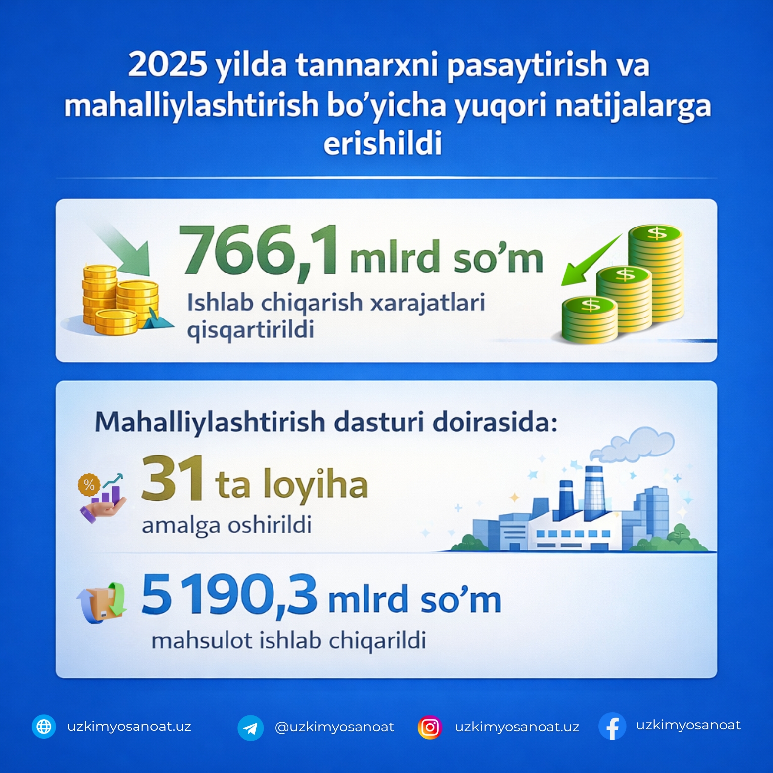2025-yilda korxonalarda tannarxni pasaytirish boʻyicha belgilangan chora-tadbirlar ijrosi doirasida ishlab chiqarish xarajatlari 766,1 mlrd soʻmga qisqartirildi.