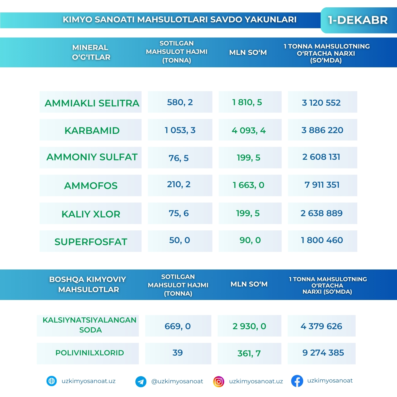 Итоги торгов продукцией химической промышленности на Узбекской республиканской товарно-сырьевой бирже за 1-декабря