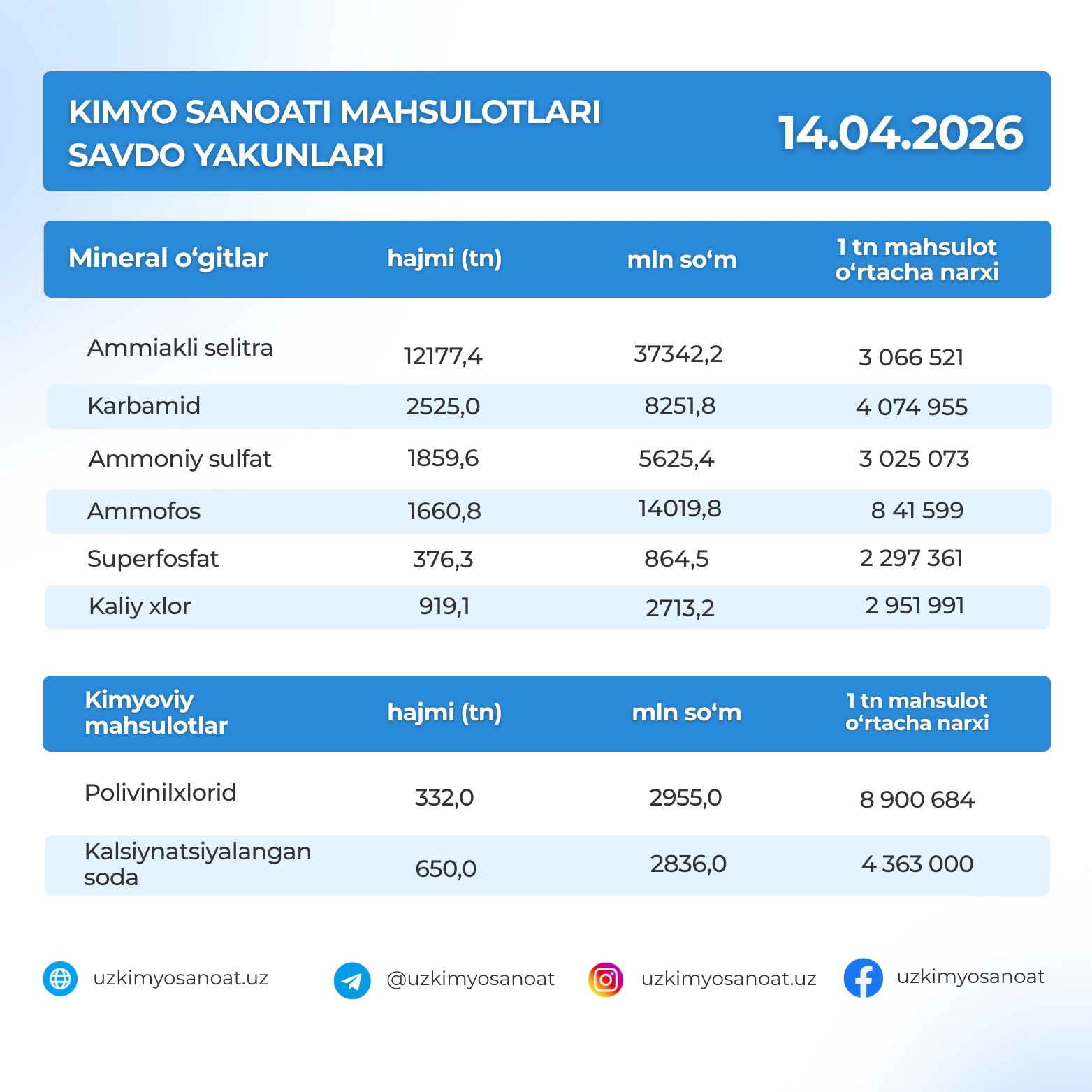 Ўзбекистон Республика товар-хом ашё биржасидаги кимё саноати маҳсулотларининг савдо якунлари: 14.04.2026
