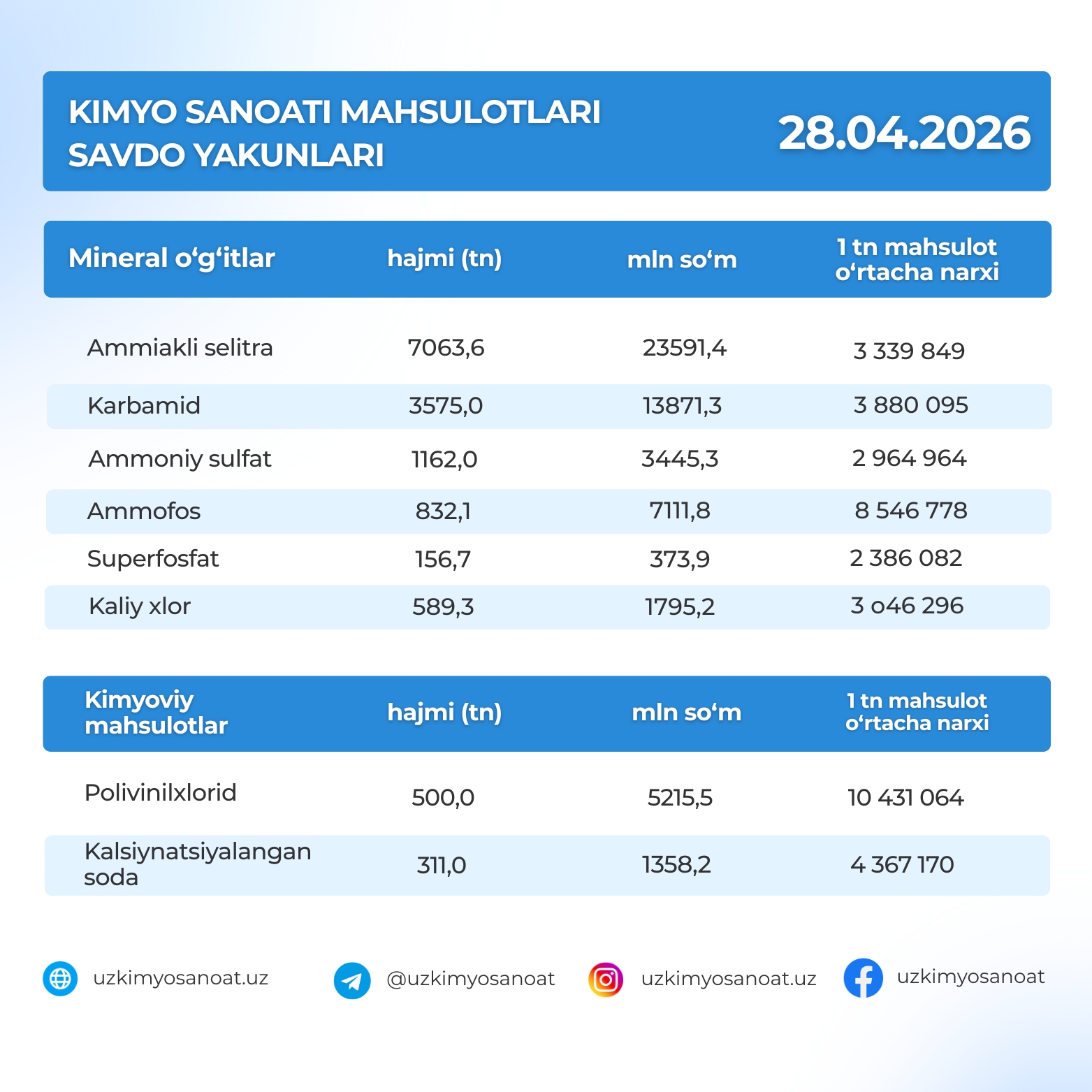 Ўзбекистон Республика товар-хом ашё биржасидаги кимё саноати маҳсулотларининг савдо якунлари: 28.04.2026