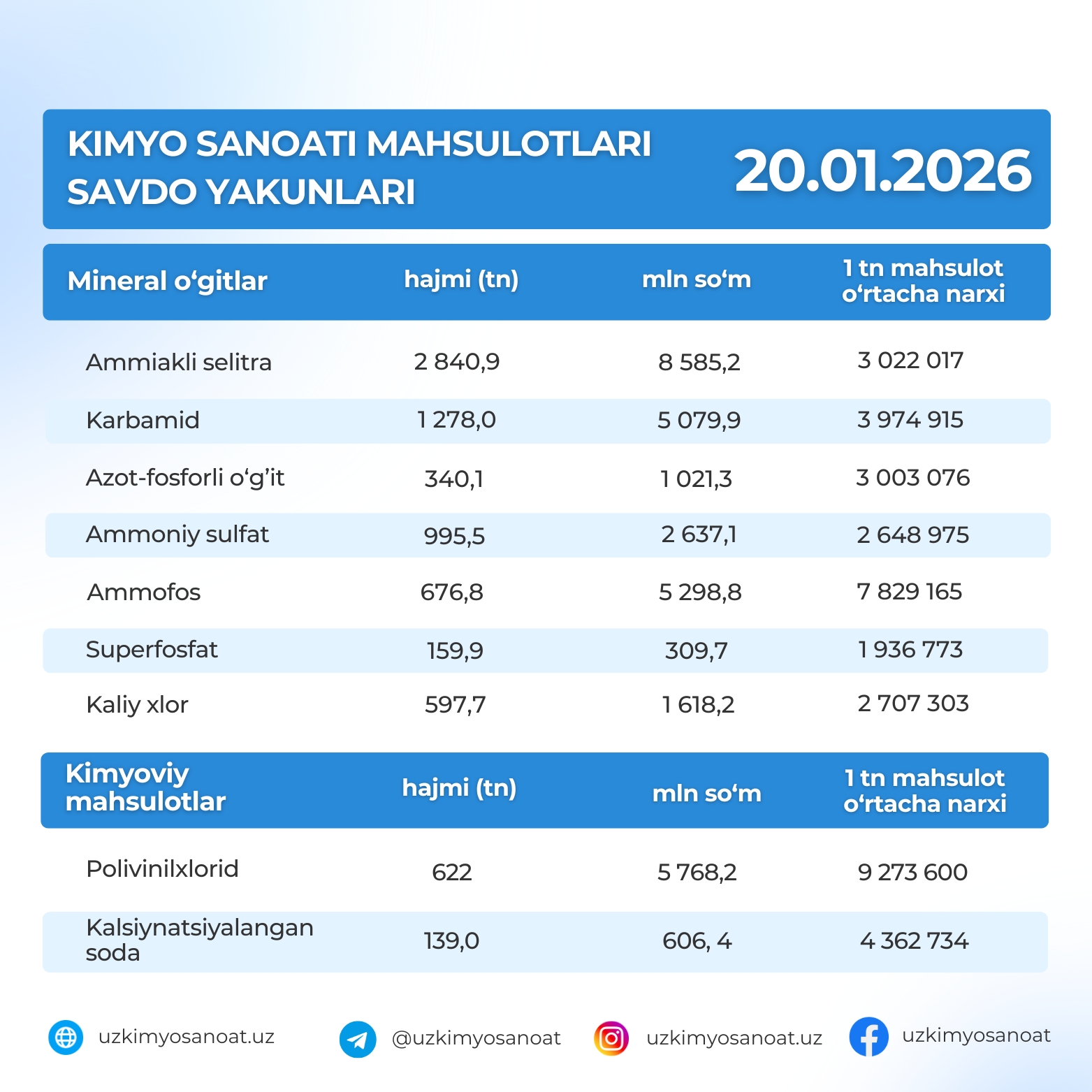 Ўзбекистон Республика товар-хом ашё биржасидаги кимё саноати маҳсулотларининг 20-январ кунидаги савдо якунлари