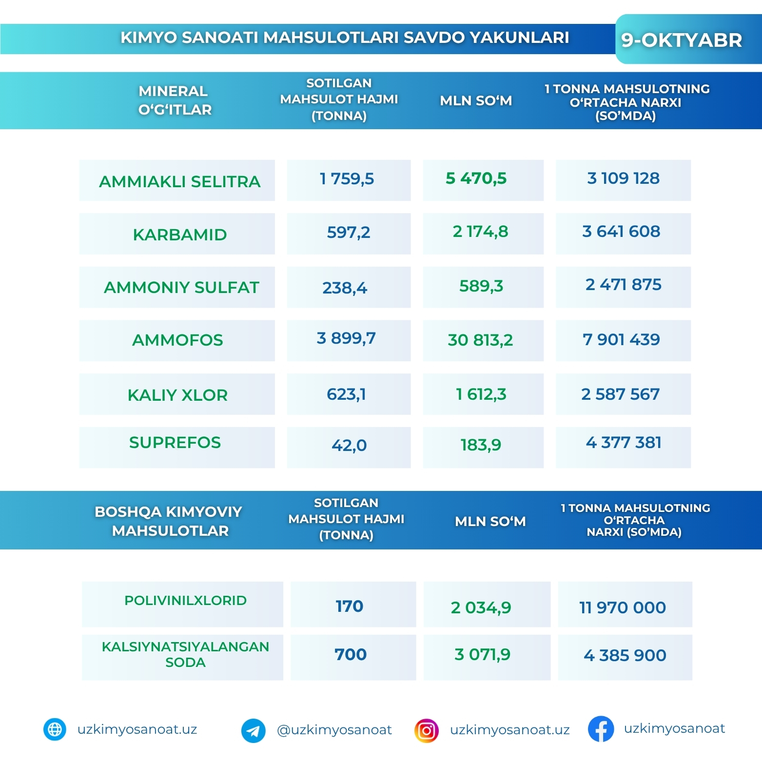 Ўзбекистон Республика товар-хом ашё биржасидаги кимё саноати маҳсулотларининг 9 октябр кунидаги савдо якунлари