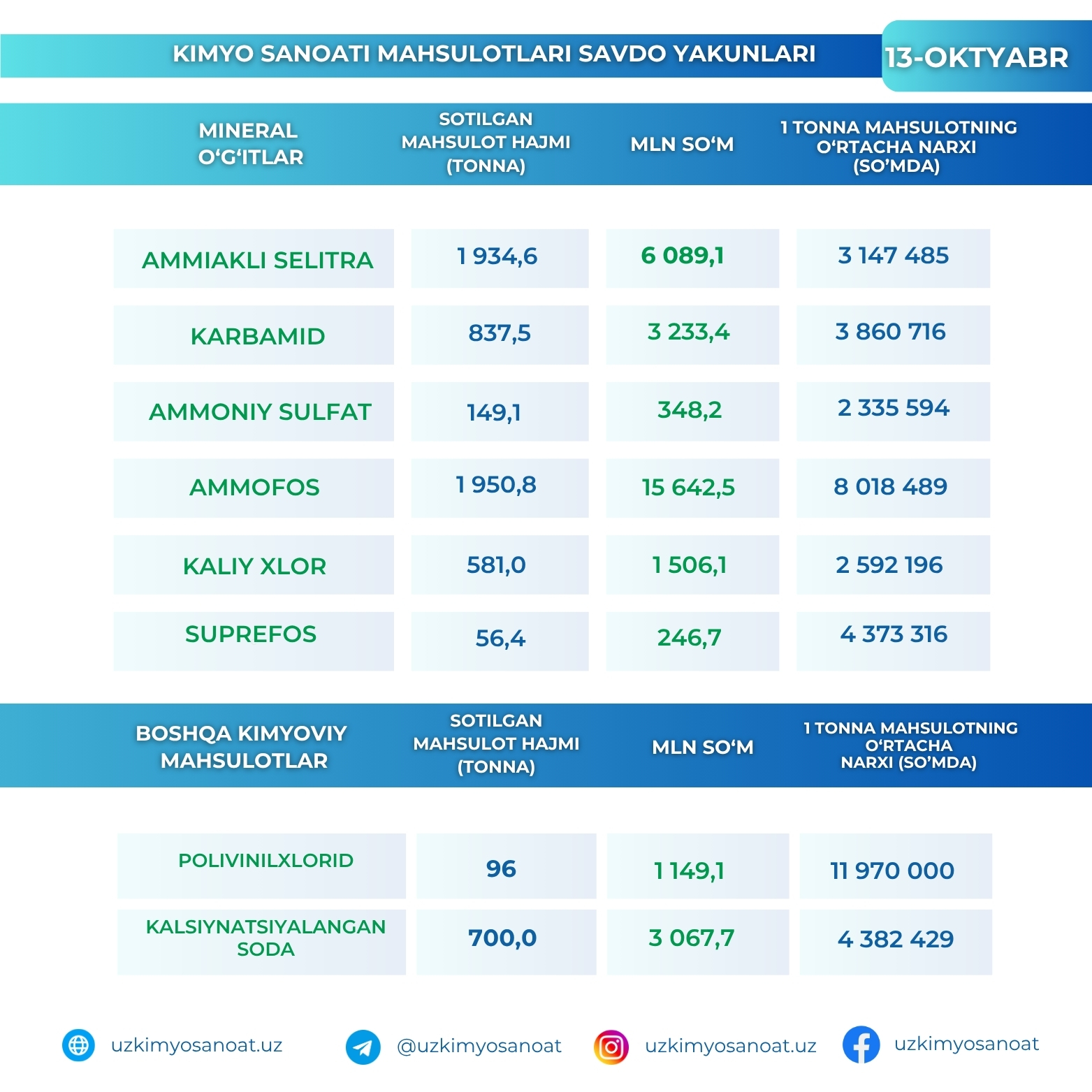 Ўзбекистон Республика товар-хом ашё биржасидаги кимё саноати маҳсулотларининг 13 октябр кунидаги савдо якунлари