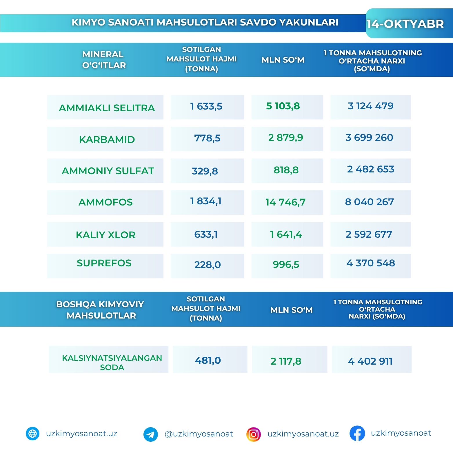 Ўзбекистон Республика товар-хом ашё биржасидаги кимё саноати маҳсулотларининг 14 октябр кунидаги савдо якунлари