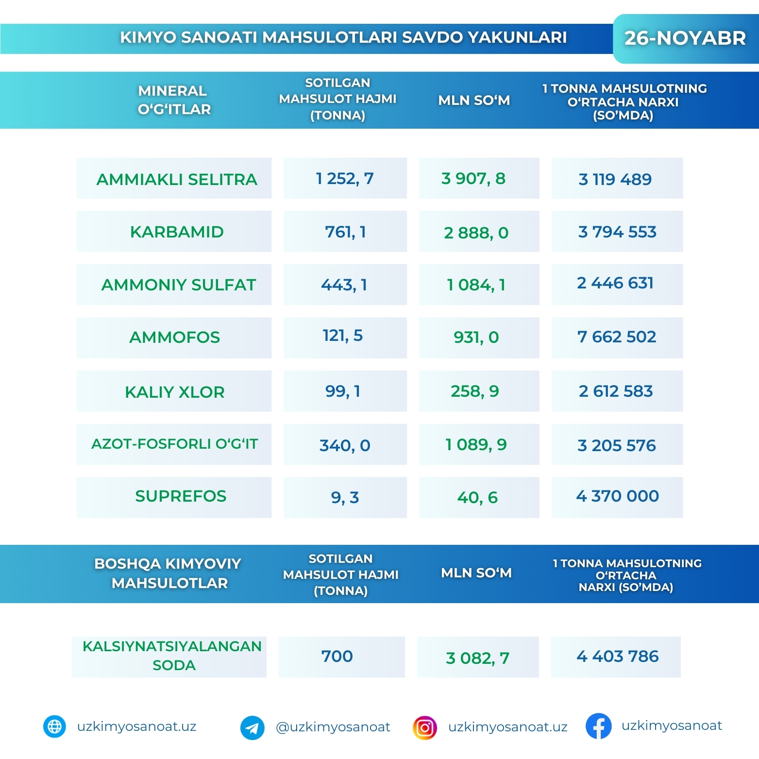Ўзбекистон Республика товар-хом ашё биржасидаги кимё саноати маҳсулотларининг 26-ноябр кунидаги савдо якунлари