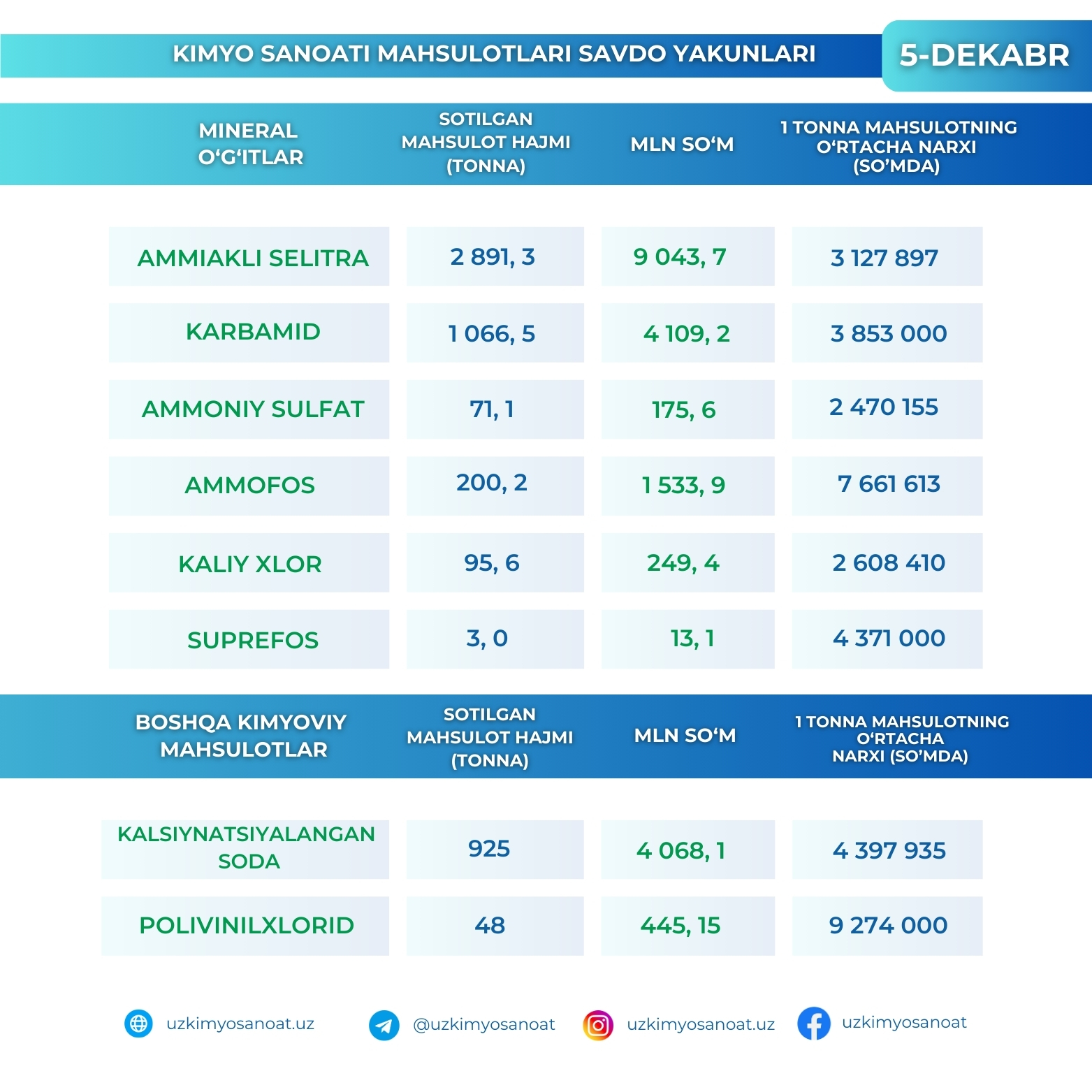 Ўзбекистон Республика товар-хом ашё биржасидаги кимё саноати маҳсулотларининг 5-декабр кунидаги савдо якунлари