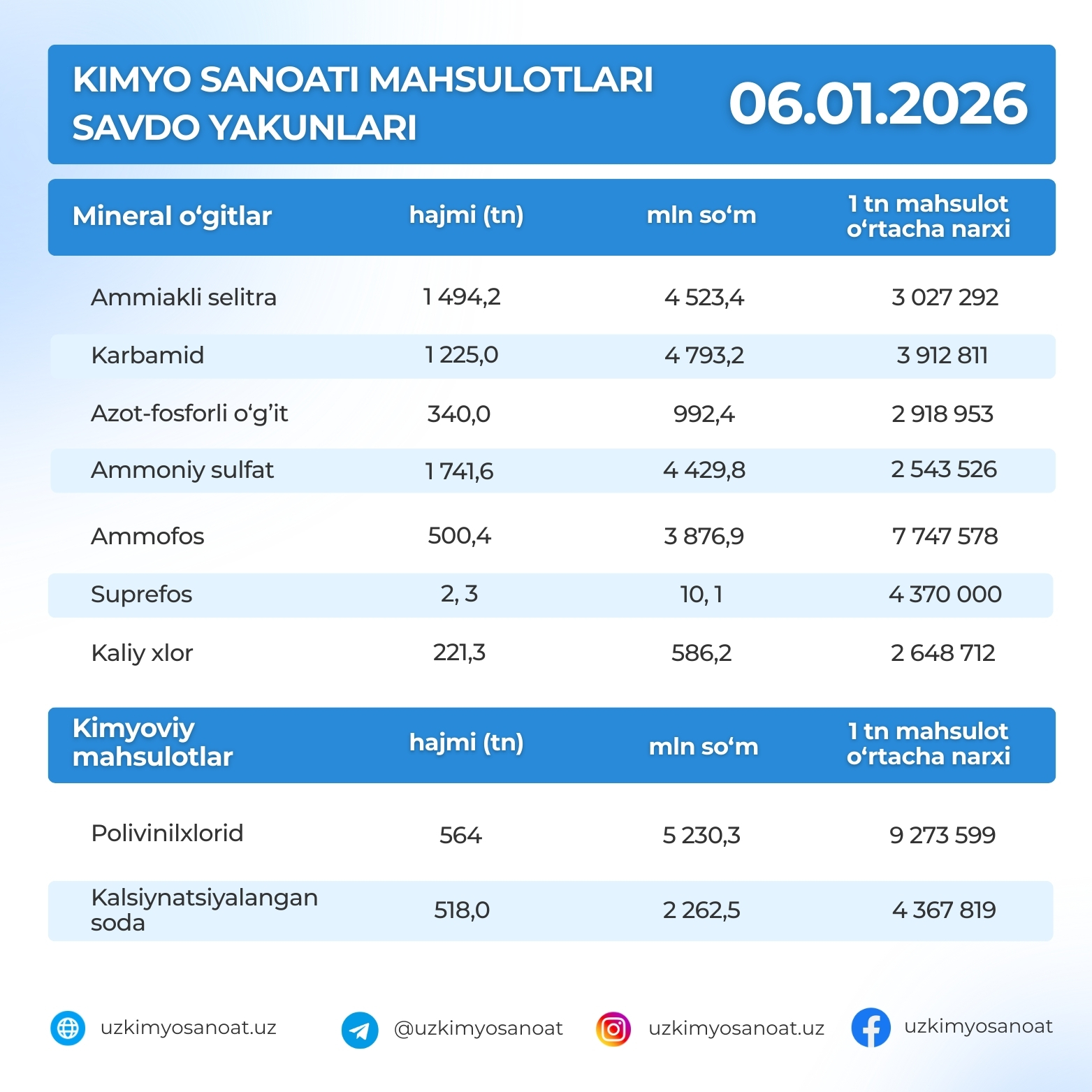 Ўзбекистон Республика товар-хом ашё биржасидаги кимё саноати маҳсулотларининг 2026-йил 6 январ кунидаги савдо якунлари