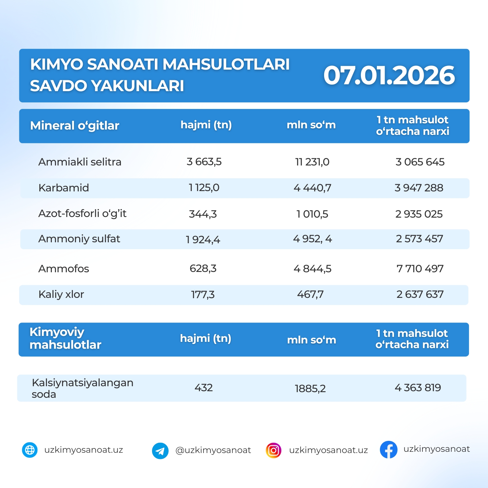 Ўзбекистон Республика товар-хом ашё биржасидаги кимё саноати маҳсулотларининг 2026-йил 7-январ кунидаги савдо якунлари