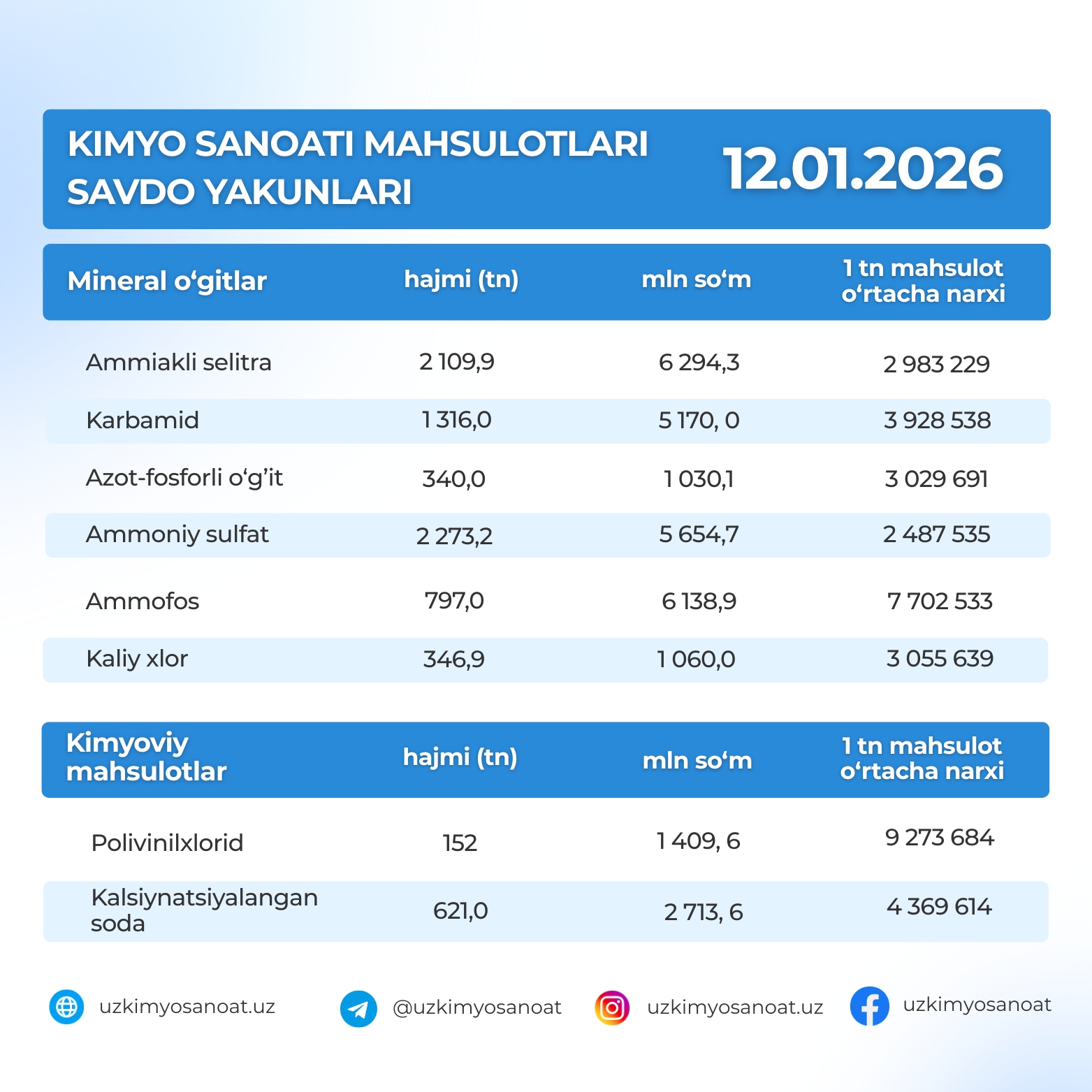 Ўзбекистон Республика товар-хом ашё биржасидаги кимё саноати маҳсулотларининг 2026-йил 12-январ кунидаги савдо якунлари
