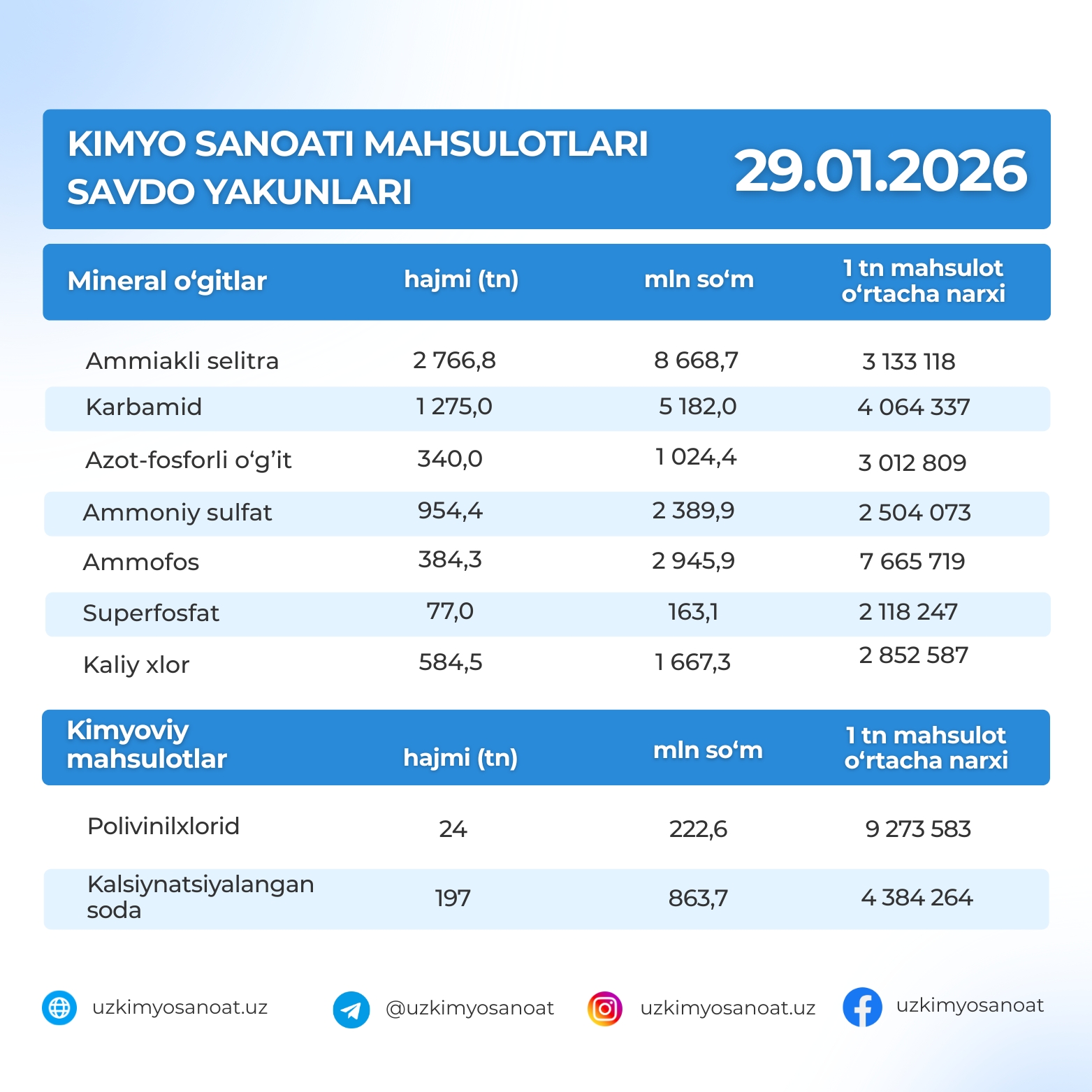 Ўзбекистон Республика товар-хом ашё биржасидаги кимё саноати маҳсулотларининг 29-январ кунидаги савдо якунлари