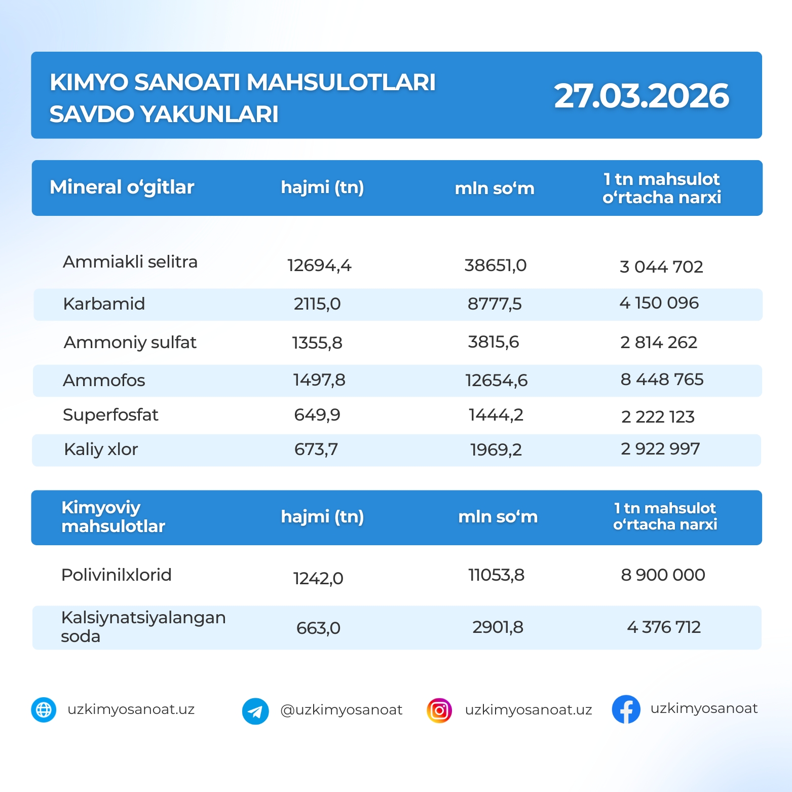 Ўзбекистон Республика товар-хом ашё биржасидаги кимё саноати маҳсулотларининг савдо якунлари: 27.03.2026