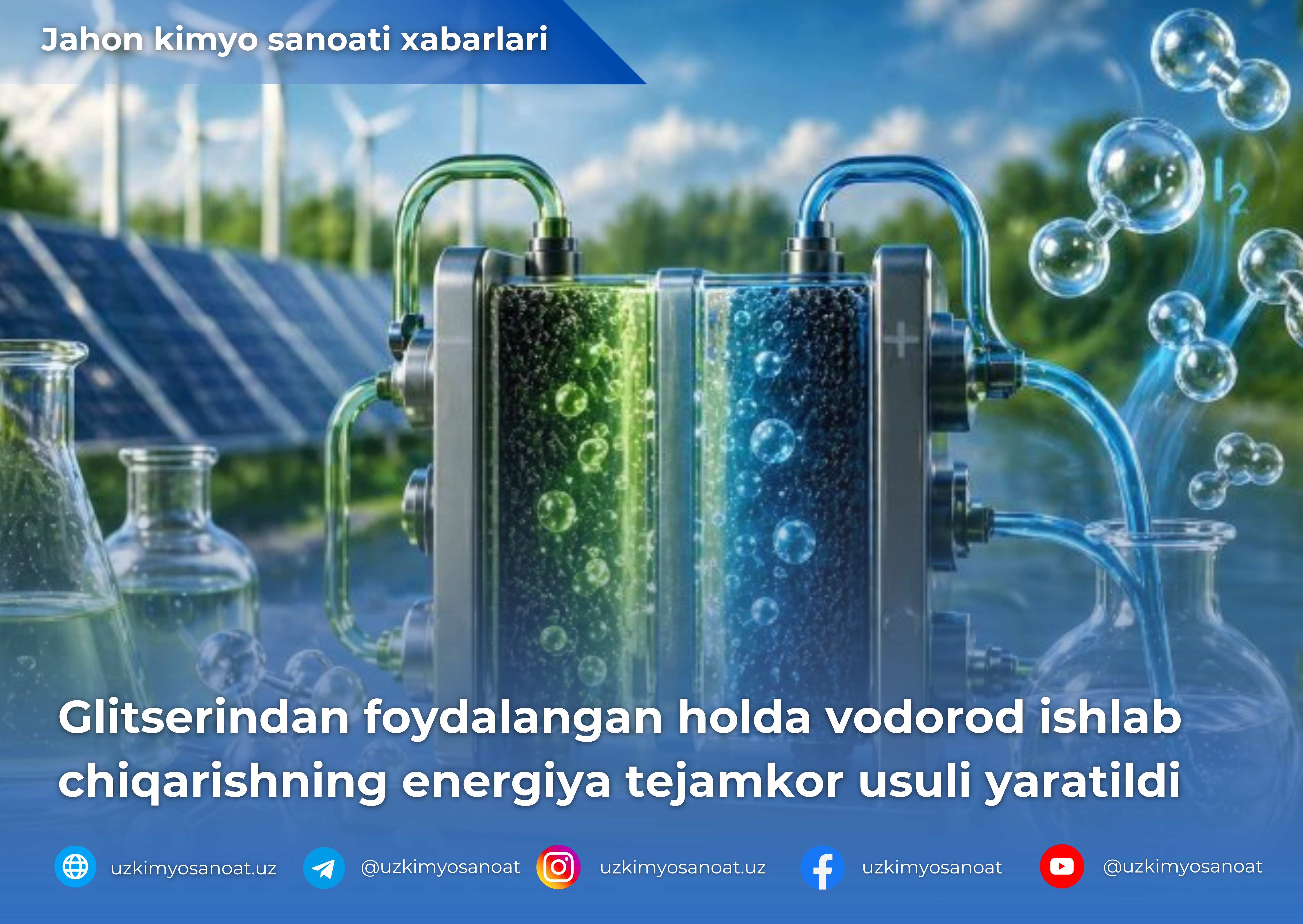Жанубий Корея тадқиқотчилари янги авлод юқори самарадорликка эга электрокимёвий тизимни тақдим этишди. У бир вақтнинг ўзида водород ва қимматли кимёвий бирикмаларни ишлаб чиқаришга қодир бўлиб, хомашё сифатида глицерин чиқиндиларидан фойдаланади. Ушбу ишланма “яшил” водород ишлаб чиқариш харажатларини камайтириш ва шу билан бирга саноатда талаб юқори бўлган кимёвий маҳсулотларни параллел синтез қилиш орқали иқтисодий самарадорликни оширишга қаратилган.