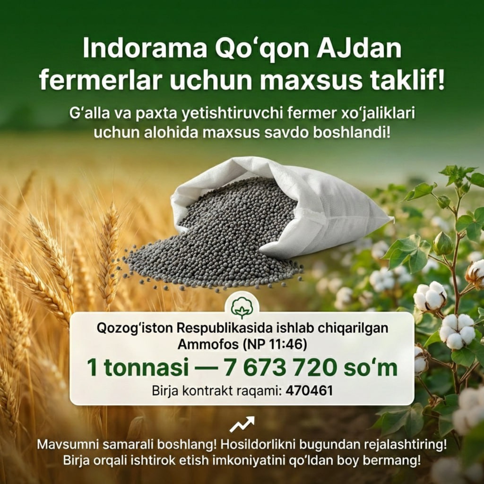 Ғалла ва пахта етиштирувчи фермер хўжаликлари учун алоҳида махсус савдо бошланди!