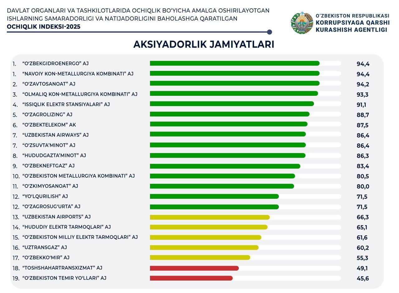 Аҳамиятлиси, мазкур рейтингда “Ўзкимёсаноат” АЖ 80,0 балл билан яшил кўрсаткични қайд этди.