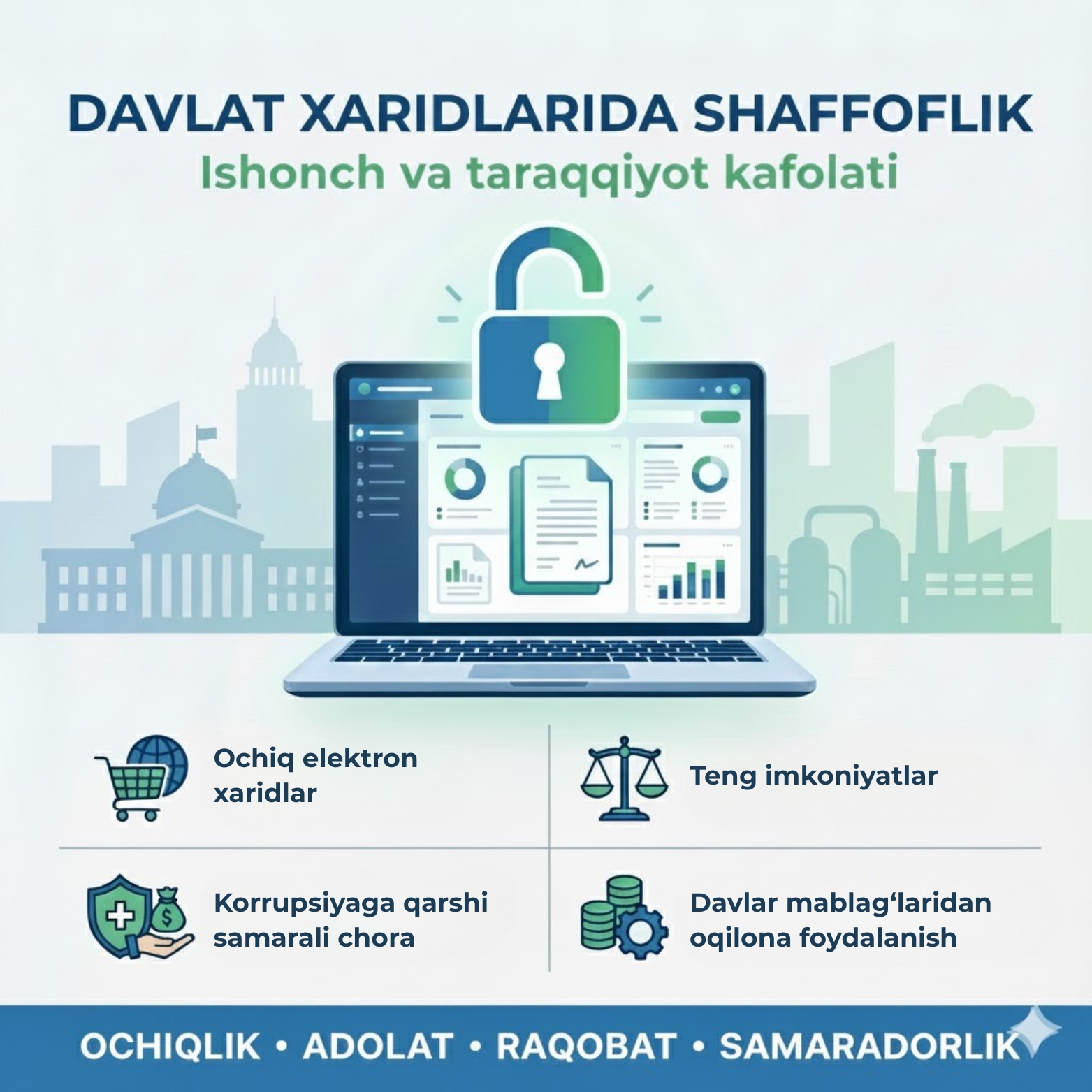 Давлат харидлари жараёнини янада соддалаштириш ва уларни тўлиқ рақамлаштириш, ушбу соҳада жамоатчилик назорати ҳамда рақобат муҳитини янада кучайтириш орқали тадбиркорлик субъектларининг иштирокини кенгайтириш бугуннинг талаби. Шу маънода «Ўзкимёсаноат» АЖ тизимида харидлар электрон платформалар орқали амалга оширилмоқда. Бу эса тендер ва танлов жараёнларида инсон омилини камайтириш, барча иштирокчилар учун тенг шароит яратиш имконини бераяпти. Харид режалари, танлов шартлари ва ғолиблар ҳақидаги маълумотларнинг очиқ эълон қилиниши очиқликни таъминлашда муҳим қадам ҳисобланади.